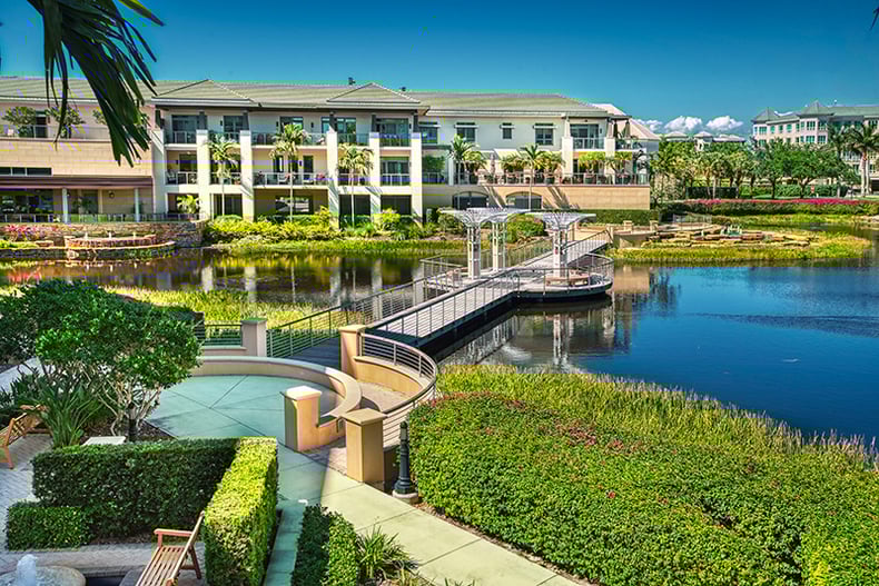 Moorings Park’s campus includes 384 independent living residences and consistently maintains a 99% occupancy rate. Depending on each resident’s choice of contract, entrance fees can include a refundable option. Residential opportunities at Moorings Park’s campus include the following: 882 to over 1,800 square feet, one, two, and three bedroom residences in two eight- story Towers; 1,202 to 2,006 square feet two or three bedroom two-story attached Garden Homes with golf course, lake, and garden views; Mid-Rise residences ranging from 1,338 to 3,366 square feet; Courtyard residences ranging from 1,345 to over 4,240 square feet; and Waterside residences starting at approximately 1,800 square feet with three residences over 5,000 square feet.